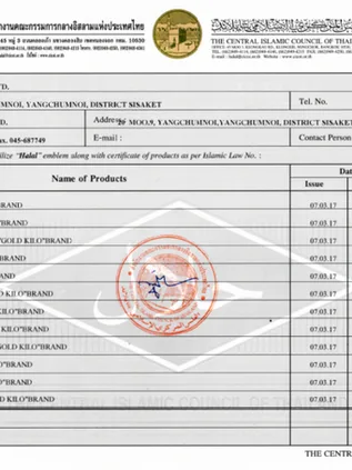 ใบรับรองจากสถาบันค้นคว้า และพัฒนาอาหาร มหาวิทยาลัยเกษตรศาสตร์รางวัล ชนะเลิศระดับประเทศ Pitching Primary GMP Award 2017FDA, GHPs สากล, HACCP, HALAL